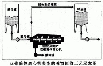 新型双锥简体离心机是一种水平放置的、具体特殊内部几何设计尺寸的高速卧螺离心机。它的分离因素可超过6000G,配置的马达为30Kw,处理量为25-30hL/h(百升/时),所分离出来的酵母固渣所含的干物质超过28%(wt),并且保持了酵母的生物活性,不会导致酵母细胞破碎。回收后的啤酒中所含酵母量极低(0.1%~O.3%V,V),并杜绝氧气的进入,保持了回收啤酒的原来风味。由于回收的啤酒对青啤酒质量无明显的影响,因此不需要进一步的处理就可以直接加入到青啤酒中。