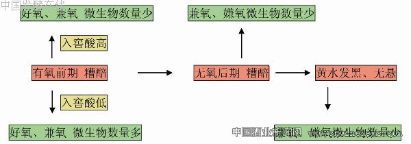 在图2中,随着酸度的增加,将加快有机酸和色素生成,加大抑制糟醅中酵母菌的生长、繁殖和代谢,降低出窖糟醅的产率,糟醅颜色深黯,出窖黄水颜色变黑。在窖内糟醅发酵的中、后期,糟醅中的酸、阻碍物和氧的耗用(探讨),又抑制了窖内的兼氧和嫌氧类微生物的生长、繁殖和代谢,出窖黄水就清淡、无悬。