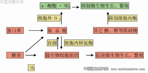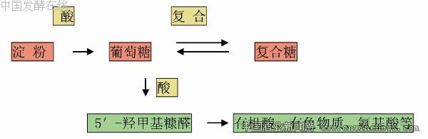 杂醇油是C原子数大于2的脂肪族醇类的统称,主要由正丙醇、异丁醇、异戊醇和活性戊醇等组成,它是构成酒类风味的重要组成物质之一,但其过量会影响酒体质量。在生产中,当黄水出现发黑和无悬现象,则酒体中的杂醇油一般会偏高,特别是入窖酸度偏高和产率影响较大的糟醅,杂醇油更高,酒体中的醛类和乙酸等也会增加。当入窖糟醅酸度较高和窖内升温困难时,淀粉的酸和酶双解糖化加快,糟醅中的糖度增加,糖份又不能被及时和充分转化,出窖糟醅的残糖偏高,在窖内糟醅中,酸的增加促进糖类酸解转化成有机酸和色素等如:图2,有机酸脱羧等反应生成杂醇油;酸的增加促进蛋白质的分解,生成氨基酸,氨基酸脱氨生成杂醇油;杂醇油还可由酵母代谢生成,在发黑和无悬黄水中,酸度高,蛋白质含量不高;有悬黄水中,蛋白质含量高。