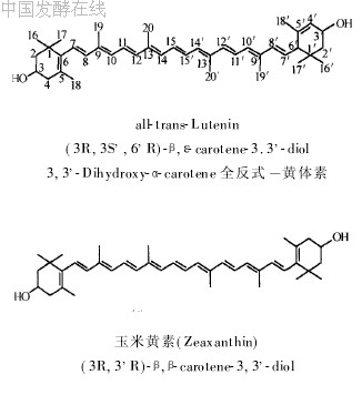 黄体素和玉米黄素互为结构同分异构体,同属于脂环族叶黄素 。它们分别是A2萝卜素和B2胡萝卜素的3,32二羟基衍生物,其结构式分别如下图所示: