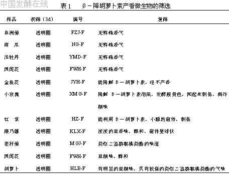 从富含类胡萝卜素的蔬菜和果类中对能降解胡萝卜素产香的微生物进行筛选,以筛选平板上透明圈的有无判断其降解微生物的能力。从各类花卉及胡萝卜上筛选到能降解胡萝卜素的真菌10种(如表1)。