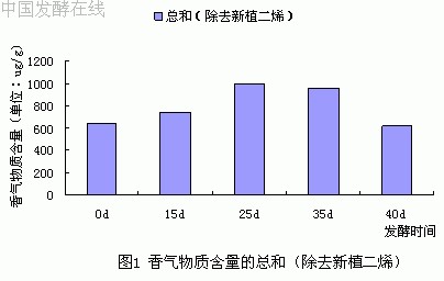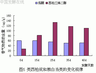 从图1、图2中我们可以明显看出,在所有的香气物质中,新植二烯的含几乎相当于其它所有香气物质含量的总和,最高含量为991ug/g。二者在整个发酵过程中的含量变化规律一致,随着发酵过程的进行,含量开始上升,到25天时达到最大值,25天后又开始下降。而其它类别的总含量次于新植二烯,在25天前呈V字形变化,25天后开始下降,在发酵25天时含量最大。类西柏烷和赖百当类与类胡萝卜素类含量变化规律一样,上升―下降,但前者在25天达到最大值,含量为188ug/g,后者在15天达到最大值,含量为136ug/g。苯丙氨酸类和棕色化产物含量较低,变化不太大,变化趋势为上升―下降,都是在15天时含量达到最大值。