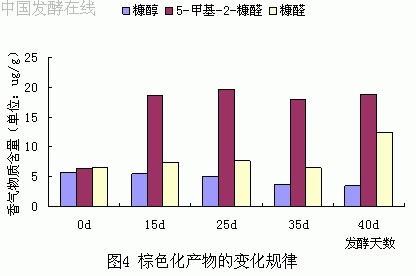 棕色化反应产物中含有不少优质烟草的致香成分,自70年代以来,美国、日本、西德都已出现过以棕色化反应产物作为烟草增香剂的专利、文献[6]。由图4可知,在发酵过程中,糠醇一直处于下降趋势,而糠醛在25天前变化不明显,在25天后呈“V”字形变化。5-甲基-2-糠醛在发酵前阶段明显上升,后阶段有所下降,而下降幅度不太明显。