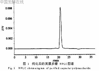 2.4.2 高效液相色谱分析 检查结果(图3)表明,经提取纯化后的荚膜多糖样品无论在分子量上还是在极性方面都比较均一,是一纯度较好的多糖样品.