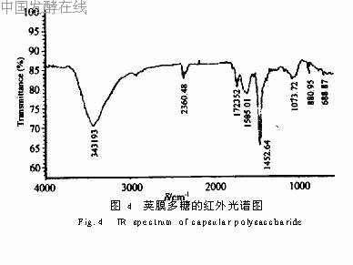 1.5.6 红外光谱法分析荚膜多糖的结构 称取5mg样品与150mg溴化钾混合压片,SPECORDIR型红外谱仪常规方法测定.