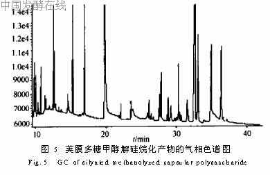 2.6 纯化后的荚膜多糖的气相色谱分析将荚膜多糖先甲醇解,再硅烷化,制成易挥发的单糖衍生物,进行气相色谱分析,见图5.GC结果表明,荚膜多糖的单糖组成主要为Gal,Glc,GlcA,Man.比值约为3.5 13.3 3.6 1.V