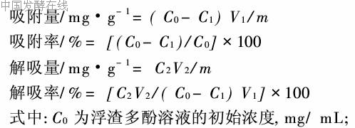 C1为树脂吸附后的平衡浓度,mg/mL;C2为解吸液中多酚浓度,mg/mL;m为树脂质量,g;V1为初始浮渣多酚溶液体积,mL;V2为解吸液溶液体积,mL。