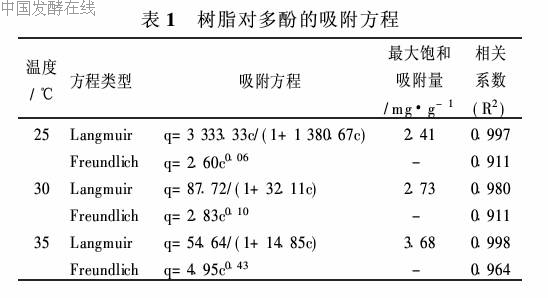 吸附等温线是研究温度和平衡浓度与吸附量之间的关系,按1·2·3方法绘制吸附等温线如图2所示。从图2中可以看出,树脂的吸附量随着温度的升高而升高,这是由于温度升高时浮渣多酚的溶解性增加,容易被树脂所吸附,而低温时浮渣多酚的水溶性降低,容易析出而不易被树脂吸附,在设定的几个温度范围内, 35℃时树脂的吸附效果最好。采用Langmuir和Freundlich吸附等温式[11,12]对吸附等温线进行线性回归,如表1所示。从相关系数可以看出,Langmuir方程拟合效果优于Freun-dlich,根据Langmuir方程计算出的最大饱和吸附量3·68mg/g略高于图2吸附等温线的最大饱和吸附量3·48 mg/g,可能的原因是因为Langmuir型属于单分子层吸附曲线方程,而实际情况并非理想的单分子层吸附。