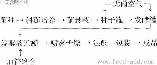 杆菌肽锌(Bc-Zn)属多肽类抗生素,其预混剂是国内外广泛使用的“动物专用”抗菌促生长饲料添加剂,用生物合成法(发酵)生产,工艺流程为:
