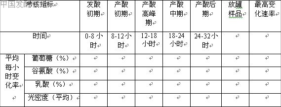 2.2 发酵成绩的描述主要考核各项变化指标在不同时间的变化率,详见表1。 表1. 发酵中各时期主要指标的描述 |