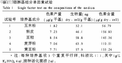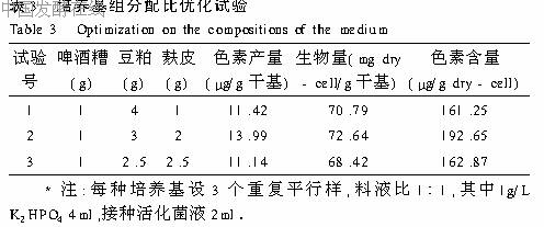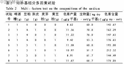 2.1.2 多因素配比试验表1单因素试验结果表明,3号培养基的色素产量最大,且该培养基的松散性较好。多因素配比试验设计及结果见表2。
