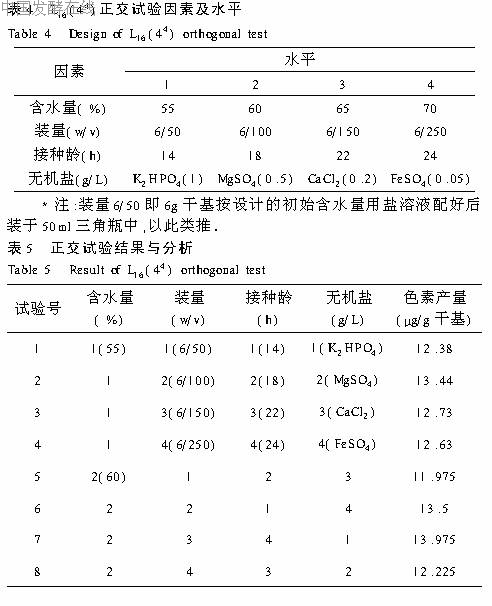 2.2.1 正交试验固态发酵是不溶性底物在足够的湿度但无游离水的状态下为微生物所发酵的过程。在此过程中,菌体细胞的生长及产物的形成都需要适宜的水分,因此控制培养基含水量是固态发酵过程中的重要环节之一[7]。基质的高含水量降低了基质的疏松度,阻止了氧气的传递,同时易受杂菌污染。相反,低含水量导致微生物生长不良。一般来说,氧气供应是固态发酵过程中必须解决的问题[8]。接种龄、无机盐等因素对细胞生长及色素产量也有不同程度的影响,故通过4因素4水平的正交试验L16(44)来确定含水量、三角瓶装量、接种龄、无机盐四个因素的最佳组合,在上述初步优化的培养基上,正交试验设计因素及水平见表4,实验结果见表5。