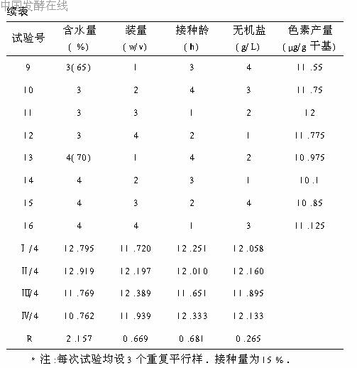 经极差分析可见,各因素对色素产量的影响次序为含水量>接种龄>装量>无机盐,其中含水量影响最大,最佳条件为含水量为60%,装量为6 150,接种龄为24h,无机盐为0.5g LMgSO4,但是试验组中没有这一组合,故补做理论最佳组合,结果色素产量为14.2μg g干基,与理论一致。