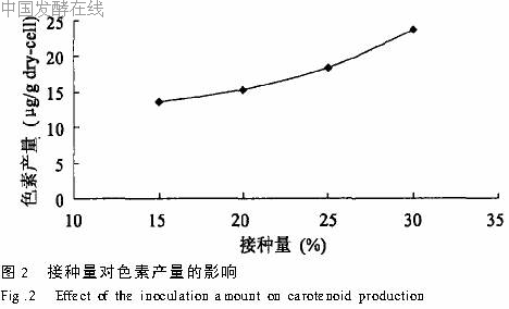 2.2.2 接种量对色素产量的影响一般液态发酵接种量在5%-10%之间,而固态发酵接种量较大,现选取4个水平探讨接种量对色素产量的影响。结果由图2可见,色素产量随接种量增大而增大,接近线性关系。