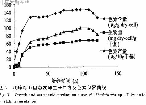 3 讨论目前国内外利用红酵母发酵生产类胡萝卜素都采用液态发酵,本文利用红酵母对农副产物进行固态发酵转化为增色饲料添加剂在国内外都属首创,尚未见到同类报道。在寻求红酵母菌株D固态发酵最佳的培养基配方和发酵工艺条件的研究中,通过单因素、多因素及因素配比试验得到初步优化的培养基为:啤酒糟∶豆粕∶麸皮=1∶3∶2。通过正交试验优化的培养条件是培养基含水量为60%,装量为6 150(即6g干基按设计的初始含水量用盐溶液配好后装于150ml三角瓶中)。接种龄为24h,无机盐为0.5g LMgSO4。接种量对色素产量影响较大,色素产量随接种量增大而增大,接近线性关系。随着发酵的进行,细胞生物量、类胡萝卜素产量和含量均逐渐增加,在96h分别达到最大值67.75mgdry-cell g干基、9.88μg g干基、145.80μg gdry-cell,培养基pH先增大后略有下降,故选定其最佳发酵周期为96h。生物量是表征微生物生长状况的一项基本参数,它与代谢产物通常有一定的对应关系[9]。固态发酵中,菌体细胞与基质交织在一起,使生物量的测定非常困难。多数应用在液体发酵的测定方法难以在固态发酵中应用。本文测定生物量的方法也存在着一定误差,所测数据均比实际值偏小,有待进一步改进测定方法,提高结果准确度。此外,温度、湿度、初始pH、培养基筛分大小等因子对固态发酵产量的影响将有待进一步研究。