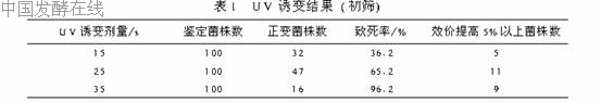 1.3.2 种子摇瓶:28℃培养48~52h,摇瓶转速240r/min.发酵摇瓶:28℃培养166~180h,摇瓶转速240r/min,接种量10%.1.3.3 发酵过程加入总量1.0%的正丙醇.1.4 效价测定采用一剂量管碟法测定生物效价[4],检定菌为短小芽孢杆菌CMCC(B)63202,标准品采用中国药品生物制品检定所制备的标准品,批号3078811,效价888u/mg.1.5 紫外线诱变处理以红色链霉菌(Streptomyceserythreus)2-9#作为出发菌株,用20mL生理盐水刮洗下培养好的新鲜斜面孢子,用玻璃珠打散,过滤,制得孢子悬浮液(3.29×106个孢子/mL),取6mL该孢子悬浮液于直径为9cm的培养皿中,置于磁力搅拌器上,在15W紫外灯管(λ=253.7nm)下(距离28.2cm)分别照射15、25、35s,稀释10-1~10-5,分别涂布于含有1.5%丙酸钠(下层)和0.2%氯化锂(上层)的梯度平板上,恒温培养.