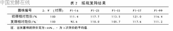 从表1的结果可知,UV与氯化锂复合处理红霉素产生菌2-9#其效果明显,其最高正变率达到47%.效价提高5%的菌株较多,作者从中选出了5株(其编号分别为F1-16、F1-25、F1-53、F1-57、F1-99)进行摇瓶复筛,结果见表2.