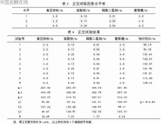 从表2的摇瓶复筛的结果可以看出,有4株菌其复筛结果效价较出发菌株提高了10%以上.作者选用F1-57高产变株进行下面的实验.2.2 高产变株的培养基优化由于红霉素高产变株F1-57是原菌株经诱变后筛选得到的,其遗传物质已经发生了改变.因此,发酵培养基的配方也应进行相应的调整,根据经验及有关文献报道,作者选择了发酵培养基中的黄豆饼粉、硫酸铵、磷酸二氢钾、葡萄糖4个因素,对红霉素高产变株F1-57,利用正交表L9(34)进行发酵培养基配方的正交试验.结果见表3、4.