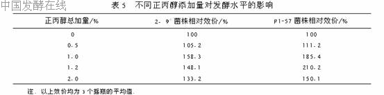 2.3 前体物的耐受性试验作者在发酵过程中加入不同量的正丙醇,加入的方法不变(基础料中加入1/3,余下2/3分5次加入),考查亲株2-9#与变株F1-57在不同正丙醇加量的条件下的发酵情况.结果见表5.