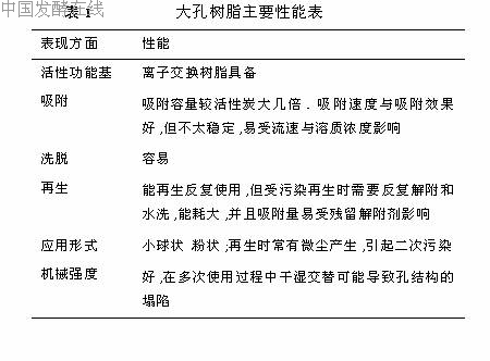 5 发展趋势随着对红霉素原料的需求激增和国际市场竞争的加剧,人们对从发酵液中分离提取红霉素的分离材料又提出了新的要求:(1)吸附量要大,吸附速度要快;(2)选择吸附能力强,可将溶液里的红霉素有选择地分离出来,大大缩减生产流程;(3)在被吸附及洗脱液中稳定性高,机械强度好,经久耐用;(4)脱附容易,能反复使用,缩短生产周期,大幅度降低生产成本;(5)可简单方便地再生,所需时间短,能耗少,物美价廉又能大量供应,在吸附过程中又有氧化还原功能,达到高效分离纯化,提高产品质量与收率,增强产品的市场竞争能力;(6)应用形式灵活,可以多种形式使用(如纱线、织物、纤维束、膜等),以及品种多,可根据不同要求使用不同品种。(7)接触红霉素发酵液界面大。近年来国内外研制生产的多种大孔树脂在很大程度上能满足上述要求,但是在性能方面,有许多局限,参见表1。要使大孔树脂满足上述新要求,就要解决大孔树脂在某些性能方面的局限性,下面的方法可供进一步研究:(1)增大比表面积,使吸附量增大,并加快吸附速度;(2)增加活性功能基,以加强选择吸附性;(3)简化再生工艺,减少能耗;(4)改变应用形状,能以多种形式使用(如纱线、织物、纤维束、膜等)。增大比表面积的有效方法之一,就要从物理形状着手,改球状、粉状为纤维状,使比表面积增加,又有利于在纤维表面接枝活性功能基,增强分离物质的选择性,同时又便于以纤维束、网状、膜等不同厚度和形式填装于各种分离设备中。球状、粉状的大孔树脂将逐渐被纤维状分离材料所替代是当前抗生素的分离提取研究中新的方向。