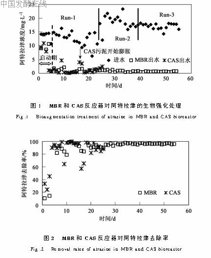 2 1 MBR和CAS反应器对阿特拉津的生物强化处理在MBR和CAS反应器中,基因工程菌对阿特拉津的生物强化处理首先经历了一个启动期,约为4d,在启动期,阿特拉津的去除率仅有20%~40%.启动之后,如图1、图2所示,MBR对阿特拉津始终保持了良好的强化处理效果,出水阿特拉津浓度保持在1mg L以下,平均为0 84mg L,平均去除率为95%.在Run 1、Run 2、Run 3这3个阶段,阿特拉津平均容积负荷分别为26、57、68mg (L·d),相应的平均去除负荷为24 5、54 1和65 1mg (L·d),最大去除负荷可以达到70mg (L·d).在启动期,阿特拉津的容积负荷较低时,阿特拉津的出水浓度也比较高,除此之外,阿特拉津容积负荷的增加不会影响MBR系统对阿特拉津的处理效果,出水阿特拉津浓度始终保持在很低的水平,如图3所示.这个结果说明MBR经过生物强化后,可以处理较高负荷的阿特拉津.本研究中,由于受到膜通量的限制,没有进一步缩短水力停留时间.CAS反应器对阿特拉津也有很好的强化处理效果,在Run 1阶段出水阿特拉津浓度也保持在1mg L左右,平均0 92mg L,平均去除率为93%.与活性污泥反应器相比,MBR的强化处理效果略好一些,但是差别不大.但是运行2周之后(14~16d),活性污泥反应器出现污泥膨胀,污泥开始流失,导致污泥浓度下降,阿特拉津去除率出现不稳定,开始下降,直到系统崩溃.