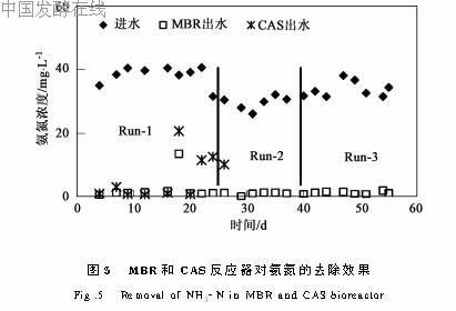 对于氨氮,MBR和CAS反应器均具有很好的去除效果,如图5所示.在Run 1、Run 2、Run 33个运行条件下,氨氮的容积负荷分别为75、87、132mg (L·d),相应地MBR对氨氮的平均去除负荷分别为70、85和130mg (L·d),最大去除负荷可以达到143mg (L·d),平均出水氨氮浓度为1 1、0 9和1 2mg L,平均氨氮去除率均为97%.可见,在本实验的氨氮负荷范围内,MBR对氨氮的去除效果没有受到氨氮负荷增加的影响.整个稳定运行期间,平均出水氨氮浓度为1 1mg L,平均去除率为97%.活性污泥反应器在稳定运行时,对氨氮也有较好的去除效果,但出现污泥膨胀之后,去除率大幅下降.
