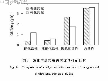 2 3 生物强化对污泥活性的影响MBR和CAS反应器对COD和氨氮的处理效果反映了污泥的碳氧化活性和硝化活性,为了进一步比较生物强化处理后污泥活性的变化,对生物强化后的MBR中污泥和普通的MBR中的污泥活性进行了比较,如图6所示.可以看到,生物强化处理后污泥的硝化活性和亚硝化活性要高于普通污泥,而碳氧化活性要低于普通污泥,而总的耗氧速率基本相当.和前面COD和氨氮的去除效果的结果相比较,可以看到强化生物处理后污泥的硝化活性和亚硝化活性比较高,保证了对氨氮很好的处理效果;而碳氧化活性比较低,使得生物强化的MBR对COD的处理效果不及普通MBR.