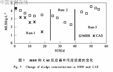 已有研究表明,阿特拉津的存在会显著降低水环境中细菌的生物量[18],对活性污泥中的微生物会产生一定程度的毒害作用[19].本研究中,MBR和CAS反应器在运行过程中都出现了污泥絮体解体、平均粒径降低、SVI值下降的现象.特别是在CAS反应器中,大量的细小污泥絮体随出水流失,导致污泥丝状菌膨胀,系统崩溃.可见,阿特拉津的存在和容积负荷的增加对活性污泥的影响非常显著,这可能是造成污泥性状变化和碳氧化活性较低的重要因素.在MBR中,虽然污泥性状也发生变化,但由于膜的高效分离作用,可以保持污泥不流失,因而在运行稳定性上具有更大的优势.