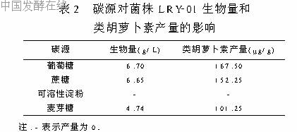 1.7 生物量的测定 将发酵液4000r/min离心20min,弃上清液;菌体用蒸馏水洗涤2遍,4000r/min离心20min,所得菌体置于100℃烘箱中烘至恒重,准确称重。1.8 类胡萝卜素含量的测定 采用改进的酸热提取法,以丙酮为空白,用722-2000型可见光分光光度计在波长480nm下测量酵母菌体提取物的吸光度,计算细胞总类胡萝卜素含量[3]。2 结果与分析2.1 碳源对类胡萝卜素产量的影响 不同碳源对菌株LRY 01生物量和类胡萝卜素产量的影响见表2。