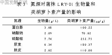 从上表可见,在所研究的4种碳源中,以葡萄糖作碳源时,菌株LRY 01的生物量和类胡萝卜素产量均最大,分别可达6.70g/L和167.50μg/g。因此,采用葡萄糖作碳源进行其他实验。2.2 氮源对类胡萝卜素产量的影响 氮源对菌株LRY 01生物量和类胡萝卜素产量的影响见表3。