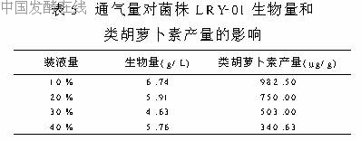 从表4可以看出,所研究的4种生长因子均对菌株LRY 01的生长和类胡萝卜素的合成有促进作用。利用核黄素作生长因子时,菌株LRY 01的生物量和类胡萝卜素产量均最大,分别可达14.70g/L和1014.38μg/g。 各种生长因子对酵母生长和类胡萝卜素合成的促进机理尚未研究透彻。根据资料分析,豆油在类胡萝卜素生物合成中起氧传递的作用,还与菌体的脂类代谢有关,可以加快菌体生长。番茄汁中含有的番茄红素是类胡萝卜素生物合成的前体物质,因而有利于菌体中类胡萝卜素产量的提高。核黄素对类胡萝卜素合成促进作用的机理可能在于核黄素可调节酵母代谢过程中酶的活性。因为核黄素在细胞中能以磷酸脂的形式结合形成两种辅酶,即黄素单核苷(FMN)和黄素腺嘌呤二核苷酸(FAD)。这两种辅酶能作为若干种酶系统的辅基。所涉及的酶系统可能是类胡萝卜素合成途径中的酶[5,6]。2.4 通气量对类胡萝卜素产量的影响 当摇瓶装液量分别为10%、20%、30%、40%时,菌株LRY 01发酵72h的生物量和类胡萝卜素产量见表5。 从上表可以看出,10%的装液量是适宜菌株LRY 01液体培养的最佳装液量。在此条件下,菌株LRY 01液体培养的生物量和类胡萝卜素产量均最大,分别可达6.74g/L和982.50μg/g。说明菌株LRY 01的生长及类胡萝卜素合成均需要充足的氧气供应。