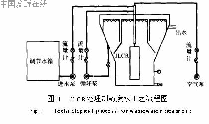 高强度好氧生物反应器(JLCR)利用物质交换和生物降解的机理发展而成,融合了当今的射流曝气、物相强化传递和紊流剪切等技术[1]。使其氧利用率较高,污泥浓度比传统活性污泥法高,能快速启动,不仅具有较高的污泥负荷与容积负荷,而且具有很好的处理效果和运行稳定性,投资和运行费用会比常规生化处理方法低。该工艺采用强制射流曝气方式对微生物进行供氧,通过循环水泵产生高压水流经喷头与空气混合射入反应器,在水流和气流共同作用下使喷头下方形成高速紊流剪切区,将吸入的空气分散成细小的气泡。在循环水泵的作用下,混合液在反应器中循环往复运行,反复充氧;在此过程中,活性污泥被不断剪切,形成了细密的絮凝体,从而使反应达到高传质和高传氧的效果。抗生素制药废水的特点是有机物浓度高,废水中含有对微生物有毒害的物质,如残留的抗生素、有机溶剂、发酵和提取的添加剂等物质对厌氧菌的毒性很强,此类废水较适合用好氧法处理;另外,由于废水有机物浓度很高(COD>2000mg/L),传统的好氧处理方式由于传氧和传质的限制不能适应此类废水。JLCR属于高效的好氧处理装置,对此类废水有较好的适应能力。本试验采用JLCR处理抗生素制药废水,并重点研究对制药废水的处理效果、运行条件及其影响因素,取得了十分满意的效果。