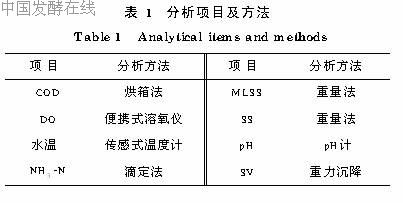 1.2.1 试验水质试验在无锡某制药厂进行,废水取自生物制药生产车间,主要生产抗生素类药。废水主要由母液废水、废菌体和洗涤水等组成,原水经过调节水箱稀释至COD3000~12000mg/L,不调节pH,不添加任何营养素,水质情况为:COD3000~12000mg/L,SS1000~5000mg/L,pH4~8.5,NH3 N50~350mg/L。废液中还含有未完全提取尽的抗生素,这些残留的抗生素对污泥有一定的毒性作用。1.2.2 分析项目与方法每天对反应器进水和系统出水的COD、SS、NH3 N以及污泥浓度MLSS、SV测定1次,均用标准方法,如表1所示。