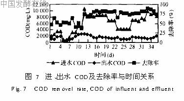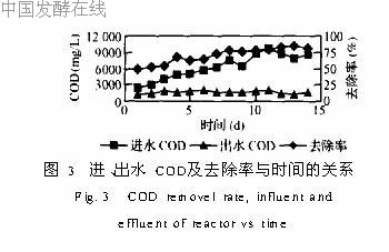 2.3 系统稳定性JLCR废水处理系统一直处于高负荷运行状态,因此,其稳定性尤为重要。试验特别观察了处理系统的稳定性。图7是JLCR运行2个多月的COD与去除率情况,可以看出进水COD的波动,并不影响出水COD,出水COD保持在2000mg/L之内,系统运行较为稳定。根据进、出水水质的连续监测结果统计,进水COD的平均浓度为5921mg/L,出水COD平均浓度为1490mg/L,由此计算COD的平均去除率为75%