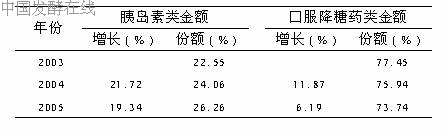 从表1可见,近年来治疗糖尿病药物中胰岛素类金额增长率较口服降糖药快,所占金额比、份额比逐渐扩大,这与2型糖尿病人早期应用胰岛素治疗有一定的关系。
