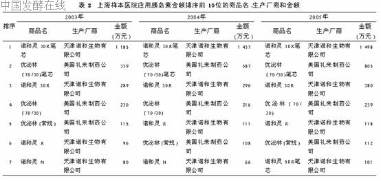 2 近年来上海样本医院应用胰岛素金额排序前10位的商品名、生产厂商和金额