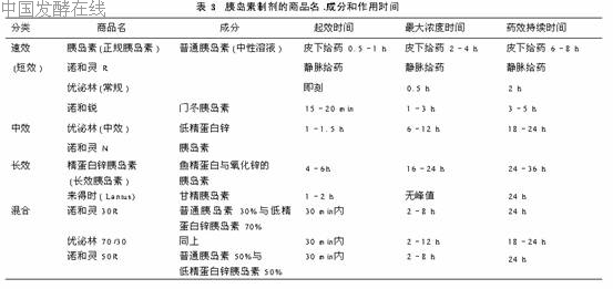 3 胰岛素制剂品种多样化,可供病人根据病情合理选用胰岛素品种很多,按作用时间可分为速效(短效)、中效和长效(见表3)。在选择胰岛素治疗方案时,需考虑病人病理生理缺陷及其生活方式的特点,有针对性地、个体化地制定控制方案,也可联合应用口服降糖药,增加胰岛素敏感性的作用,减少胰岛素治疗带来的低血糖、增重、水肿等不良反应。胰岛素应用量名列前茅的天津诺和生物有限公司的诺和灵30R笔芯和美国礼来公司的优泌林(70/30混合)笔芯,是短效和长效混合胰岛素,优点是可即刻起效,形成近似于生理状态的快速分泌峰,随后作用时间平稳持久,笔芯使用方便。从表2、表3可见,天津诺和生物有限公司和美国礼来制药公司以质量、品种的优势赢得了医师和患者的信任,牢牢霸占了上海胰岛素的主要市场。2006年1月被美国FDA批准上市的辉瑞公司吸入式胰岛素Exubera,将给糖尿病人带来一种新的给药方法,市场前景有待观察。