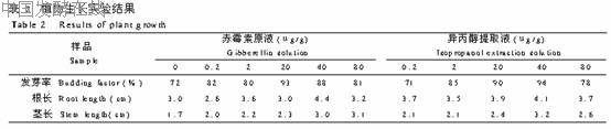 3.3.1 结构定性印证 紫外扫描结果显示,提取物与原赤霉素最大吸收峰均在250nm处,峰位置没发生变化。证实提取物的共轭结构不受萃取体系的影响。提取液于40℃鼓风干燥4h后35℃隔夜真空干燥。标准物质及提取物的红外光谱扫描结果显示:因醇、盐等物质的存在,使谱图中少数峰稍有偏移,或峰形的轻微扩张,但提取物的红外光谱图显示的特征峰位置与标准品基本一致。UV和IR的结果表征说明,萃取体系不影响提取物的结构。3.3.2 提取物纯度色谱定性 因赤霉素摩尔质量较小,故用离子交换法脱盐处理,进行色谱定性。图3的液相色谱图显示,除了4.29min出现甲醇的溶剂峰外,赤霉素的保留时间均为3.53min。为确认提取物是在萃取体系被纯化,作GC实验,并借乙醇作成相剂的萃取结果对照说明。图4为赤霉素原样、乙醇提取样、异丙醇提取样的甲醇溶液的气相色谱峰形。结果显示,在保留时间约4.7min均出现形状相似峰形。色谱定性前均经过相同的离子交换预处理残留于醇相的盐,比较图4中体系4与3,体系4的杂质峰大大减少,表明异丙醇相对赤霉素的提取有纯化作用。也可作为合理的实验结果证实,赤霉素的纯化是醇/盐水体系萃取实现,而不是离子交换。多次扫描的色谱图谱的再现性也很好。表明异丙醇/盐 水萃取体系,对发酵液中赤霉素的提取有较高的选择性。3.3.3 生物活性实验结果 表2可以看出,同浓度对照组相比,对绿豆的发芽率及幼苗的生长的影响结果基本一致。说明醇/盐 水体系萃取的赤霉素对作物的生长同样发挥作用。