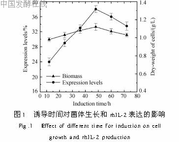 1 2 8 活性测定:IL_2生物活性测定,是检测IL_2激活的IL_2依赖性细胞CTLL的增殖程度,用MTT检测法来测定[9,10]。2 结果与讨论2 1 工程菌表达条件优化2 1 1 诱导时间的影响:考察诱导时间可以了解外源蛋白分泌表达和菌体生长的情况,并可据此判断发酵结束的时间。以含0 5%甲醇的BMMY培养基进行诱导,每12小时取样,平行实验3次,检测结果见图1。从12h开始,随时间延长表达量逐渐增加,培养48h达到高峰值,占总蛋白38%,然后缓慢下降,而菌体浓度变化不大。2 1 2 甲醇诱导浓度的影响:按摇瓶培养法每隔24h分别补加甲醇使其终浓度为0 5%、1%、1 5%、2%、3%、4%、5%,诱导培养48h。平行实验3次以上,结果如下:当甲醇诱导浓度为0 5%时,其残留浓度较低,同时细胞光密度也较低,说明此时甲醇成为限制性底物;当甲醇浓度为1%时,其残留浓度较低但OD600最大,说明在其他条件不变的情况下此浓度最适于菌体生长;当甲醇浓度大于1 5%后,其残留浓度较高,OD600下降,说明在此浓度范围细胞生长受到抑制。从毕赤酵母表达目的蛋白量来看,在甲醇浓度为1%时达到最高。