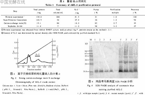 利用大肠杆菌、酵母和哺乳动物细胞已成功表达了重组人IL_2,不过大量生产重组IL_2主要还是使用大肠杆菌,因此有关rhIL_2的纯化也多限于从大肠杆菌中提取。从大肠杆菌中生产重组IL_2的方法已成熟[3,11]。虞建良[12](1995年)构建了IL_2的高效表达质粒,获得了高产工程菌株,并建立了目前国内外最为简单迅速而高效的IL_2纯化方法。本文首次在巴斯德毕赤酵母中表达与纯化分泌型天然及突变型rhIL_2,从该表达系统中纯化rhIL_2是一个全新的探索过程,用大肠杆菌生产rhIL_2首先遇到的就是包含体的处理问题。无论采用促溶剂盐酸胍或尿素还是表面活性剂十二烷基硫酸钠(SDS)两种方法,促使rIL_2从包含体中溶出,但都存在一定的缺点,如SDS可与IL_2结合,盐酸胍和尿素会使大量杂蛋白与IL_2一起进入沉淀,造成进一步纯化困难。用巴斯德毕赤酵母表达的rhIL_2是分泌型的,即rhIL_2在诱导表达过程中直接分泌到发酵液中,突破了大肠杆菌对包含体的处理问题及rhIL_2的变性、复性问题。