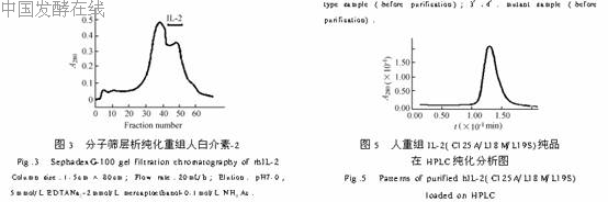 2 2 rhIL_2纯化rhIL_2粗提液经强阳离子交换S柱色谱,得到四个峰(图2),电泳鉴定其中0 55mol LNaCl洗脱组分为rhIL_2,位于第4峰,纯度达85%。离子交换分离得到的较纯的rhIL_2经SephedexG_100凝胶过滤色谱分离,得到3个组分(图3),电泳鉴定rhIL_2位于第2、3峰间,靠近3峰,合并样品46~48管,电泳鉴定为单一条带(上样量20μg),纯度为98%。纯化样品的电泳结果如图4。纯化过程总的回收率27%,见Table1。将最后纯化得到的rhIL_2上高压液相色谱(HPLC),只有一条带(图5)。