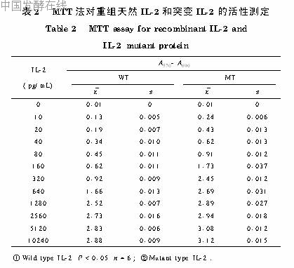 2 3 分子量的测定6种标准蛋白分子量分别为94kD、67kD、43kD、30kD、20kD、14 4kD(图4),将其迁移率对分子量的对数作图,所得标准曲线为lgMr=4 962_1 168Rf,相关系数r=-0 986(P<0 001,n=5)。将rhIL_2迁移率代入计算得分子量为14 5kD,与理论值15kD相差小于5%,基本符合。2 4 生物活性测定上述纯化所得的rhIL_2纯品用MTT法测活,每微克IL_2加入50μg牛血清白蛋白(BSA)定容于50mmol L乙酸铵pH4 0中,冷冻干燥成干粉。用MTT法测活前,溶解于4mmol LHCl中并达到含0 1%BSA,制成IL_2终浓度为1μg mL的缓冲液,并用0 2μm微孔滤膜过滤。表2显示该样本两次测活的结果。每一次测活代表同一样本重复3次。结果显示样本两次测定虽有差异,但突变型IL_2引起CTLL_2细胞的增殖明显高于野生型IL_2,并可从中计算出突变型IL_2的活力是野生型IL_2的4 4倍。