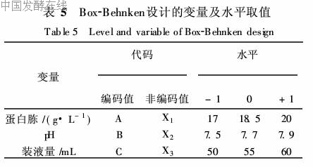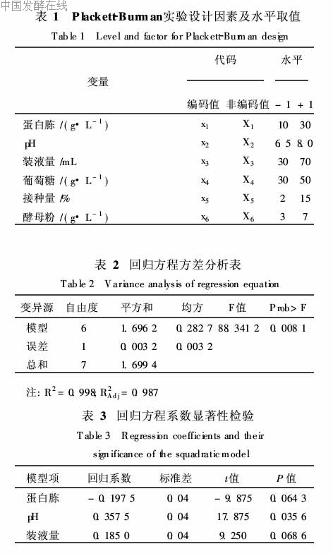 1. 2. 5 数据处理 Plackett-Burman实验设计及Box-Behnken实验设计表中,自变量编码方程: xi=(Xi-X0) /ΔXi,式中xi为自变量的编码值,Xi为自变量的实际水平值,X0为实验水平中心点的实际值,ΔXi为单变量增值。
