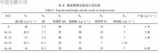 根据式1中回归系数的符号和大小,结合实验的实际需要,在最陡爬坡实验中对影响纳他霉素产量因素的变化方向和步长进行相应设计,具体取值和实验结果见表5。而其他因素的取值则根据正效应因素均取较高值、负效应因素均取较低值的原则做如下安排:葡萄糖50 g/L,酵母粉7 g/L,接种量15%。表4列出了各显著因素的变化方向、步长和实验结果。由表4可知,纳他霉素产量在0到0+1△之间有一个明显的上升,之后开始下降,最优发酵条件在0+1△和0+2△之间,故以0+1△条件为后续实验的中心点。