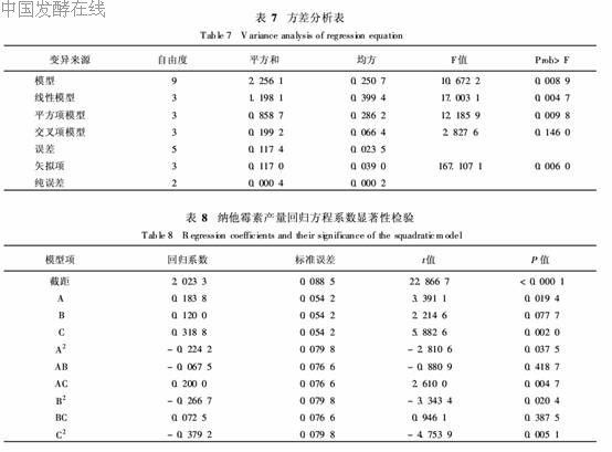 表7的方差分析表明,该回归方程显著(P=0. 008 9)。R2Adj值为0. 861 5,表明纳他霉素产量86. 15%的变异分布在方程的9个因子中,其总变异中仅有13. 85%不能由该模型来解释,R2值为0. 950 5,表明纳他霉素产量实测值与预测值之间具有较好的拟合度。因此该模型可用于预测纳他霉素产量的实际情况。