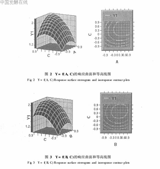由回归方程系数显著性检验(表8)可知,因素C对纳他霉素产量线性效应显著,而因素A和B对纳他霉素产量的线性效应不显著;因素C2对纳他霉素产量其曲面效应显著,而因素A2和B2对纳他霉素产量曲面效应不显著;因素AC对纳他霉素产量交互效应比较显著,因素AB和BC对纳他霉素产量交互效应不显著。