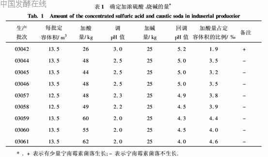 2.1 工业生产中浓硫酸和烧碱用量的确定表1数据表明,在酸化的9批发酵液中,浓硫酸的加量占发酵液体积范围在3.2‰~ 4.6‰,平均为3·75‰,加碱量约占发酵液体积1.88‰.酸化处理的发酵液经过培菌室进行菌落培养,结果无宁南霉素菌落生长,说明工业化生产用浓硫酸处理宁南霉素发酵液后,无活的宁南霉素菌丝体存在.因此,当酸化用浓硫酸的加量在3.5‰~ 4.0‰之间,回调pH值加碱量在1.5‰~ 2.0‰之间时,完全可以满足工业化生产要求.