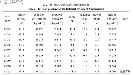 表2列出宁南霉素酸化液浓缩后的生物效价平均在23 000μg/mL左右,高于宁南霉素产品的质量标准,说明酸处理发酵液对宁南霉素生物效价无影响,而且产品比较稳定.