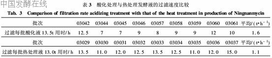 用浓硫酸处理发酵液时,加入浓硫酸的量为定容体积的3.5‰~ 4.0‰,pH值控制在2.0~2.5之间,则宁南霉素发酵液中就无活的菌丝体存在,灭菌效果好,因此酸化处理发酵液适合工业化生产.酸化处理宁南霉素发酵液,对宁南霉素产品生物效价无任何影响,产品质量稳定,附合产品质量标准.酸化处理发酵液过滤速度快,省时省力,节约能源,降低成本,提高劳动效率,增加经济效益和社会效益,因此有利于工业化大生产.综上所述,利用浓硫酸处理发酵液灭菌效果好,适合工业化大生产,具有良好的经济和社会效益.