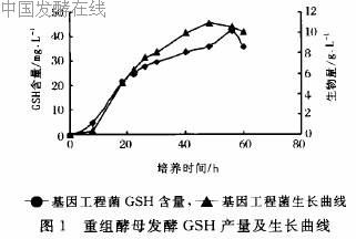 按上述方法挑取新鲜平板上的单菌落接种到YEPD种子培养基培养24h后,在液体YEPD发酵液中发酵。重组酵母GSH产量及生长曲线如图1所示,在发酵48h时,细胞生物量达到最大积累,但是GSH积累还未停止。发酵56h时,GSH含量达到最大的积累为42.2mg/L,约是宿主菌的1.6倍。因此选择发酵时间为56h。